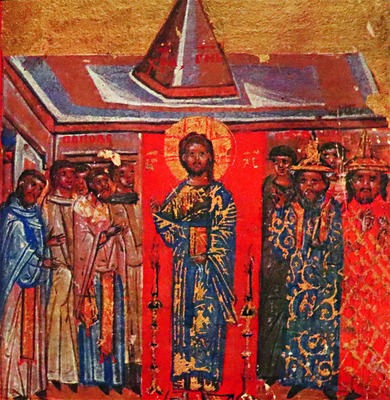 В конхе центральной апсиды рашских храмов традиционно изображаются Богородица с Младенцем и с поклоняющимися Ей 2 архангелами, «Евхаристия» - в среднем и «Служба св. отцов» - в нижнем регистре, при этом в Сопочани и в Арилье композиционным центром «Службы…» является изображение Христа-Агнца в виде Младенца, к Которому направляется процессия архиепископов. Извод этой сцены под названием «Поклонение жертве» впервые появился в кон. XII в. и широко использовался в многочисленных памятниках XIV в. (Walter. 1982. P. 202). В ц. св. Апостолов в Пече конху апсиды занимает Деисус, что соответствует погребальному назначению храма, создававшемуся как усыпальница сербских епископов по образцу ц. св. Апостолов в К-поле. Необычное расположение сцены «Евхаристия» можно отметить в мон-ре Милешева, где между парусами на дополнительных полукруглых участках размещены 4 сцены: «Снятие с креста» с юж. стороны, «Преображение» - с северной, «Евхаристия» - с западной и «Благословение учеников перед Вознесением» - с восточной.