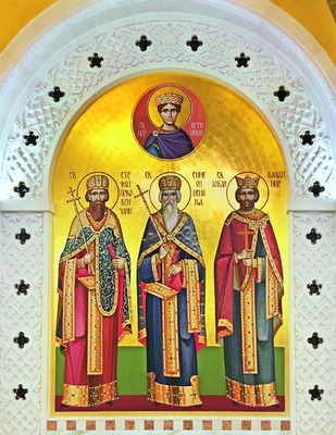 Тема сербской святости раскрыта в программе по-разному, прежде всего через образ свт. Саввы. Его житию посвящен главный фасад, он изображен в нескольких местах: над сев.-зап. порталом, в молитве перед Нерукотворным убрусом Господним (над юго-зап. порталом находится образ его отца, прп. Симеона Мироточивого), в медальоне в алтарной апсиде вместе со сщмч. Феодором, еп. Вршацким, и свт. Николаем Жичским, митрополитами Василием Острожским и Петром Цетинским, патриархами Кириллом I и Никоном, митр. сщмч. Петром (Зимоничем) и свт. Иосифом Новым (Фуско), архиеп. свт. Максимом, еп. Платоном (Йовановичем). Еще один Собор серб. святителей представлен в мозаиках диаконника: под композицией «Души праведных в руце Божией» выложены изображения 7 патриархов, при к-рых строился храм свт. Саввы вплоть до патриарха Иринея (2010-2020). В диаконнике, в люнете вост. стены над аркой, свт. Савва со свт. Николаем Чудотворцем предстоят Богоматери в изводе «Живоносный Источник». Образ свт. Саввы занимает место на хоросе лицом к зап. входу, с др. чтимыми святыми (работы серб. худож. Е. Хинич). На малом кольце хороса написан на серб. языке текст Символа веры; киворий в алтаре увенчан разновидностью равноконечного креста - «сербским крестом», т. н. крестом свт. Саввы. Среди мн. примеров «цитирования» шедевров монументальной средневек. живописи Сербии один из самых ярких - композиция «Явление ангела женам-мироносицам» на юж. стене алтаря, к-рая восходит к фреске ц. Вознесения Господня в мон-ре Милешева (до 1228), известной как «Белый Ангел».