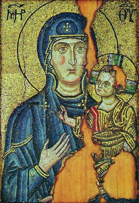 Одна из первых серб. икон - мозаичный образ Богородицы «Одигитрия» (кон. XII - нач. XIII в.) из мон-ря Хиландар - исполнена, вероятно, далматинским мастером и стилистически близка к венецианско-визант. произведениям. Спокойное выражение, отсутствие особой эмоциональной окрашенности, округлый лик с румянцем на щеках указывают на тип искусства раннего XIII в., известный по фресковым образам мон-ря Студеница (Богоматерь Студеницкая, св. Стефан и др.) (Попова. 2013. С. 345).