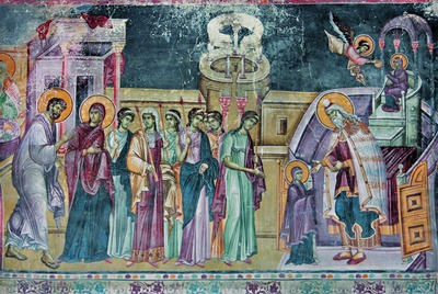 Своды и верхние части стен посвящены жизни Христа и Богоматери, праздничному циклу отведены 3 малых полукупола - южный, северный и западный, а также широкие подпружные арки над ними. В сев. конхе - «Рождество Христово». К каждому полукуполу примыкает арка, к-рая вмещает 4 композиции. Дополнительные сюжеты сочетаются с «Воскресением - Сошествием во ад» в юж. конхе как с частью Страстного цикла, а «Сошествие Св. Духа» завершает собой Пасхальный цикл. «Успение Богоматери» на западе окружено сюжетами из цикла «Рождество Пресв. Богородицы». На малых подпружных арках - медальоны с изображениями апостолов от 70. Под конхами, в зоне хор, разворачиваются сцены Сотворения мира и начального этапа истории человечества, с ними соседствуют в простенках прообразовательные сюжеты, а также чудеса Христовы. На колоннах в центральной части храма помещены поясные изображения столпников, между колоннами вписаны ростовые фигуры св. воинов и преподобных.
