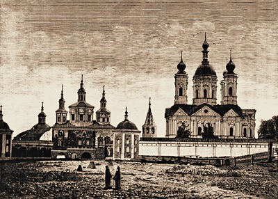 В 1734 г. наместник Варсонофий писал прошение в Синодальный приказ, предлагая разобрать в С. У. м. ветхую каменную Преображенскую ц. и вновь построить ее над зап. ярмарочными вратами. В 1738 г. столяры москвичи Иван Афанасьев и Никита Иванов с калужанином Михаилом Медведевым со товарищи сообщали наместнику иером. Иоилю (Савицкому) об изготовлении иконостаса для этой церкви (Там же. Ед. хр. 261. Л. 1). Надвратная Преображенская ц. была освящена в 1742 г., на ее престол был прислан антиминс, выданный 3 мая того же года за подписью митр. Тверского и Кашинского Митрофана (Слотвинского).
