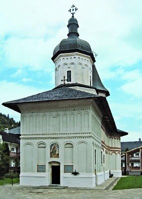 В целом архитектура кафоликона Усекновения главы св. Иоанна Предтечи (1602) представляет смешение валашских и молдавских традиций зодчества. Церковь 3-конховая в плане, с расположенными по принципу анфилады алтарной апсидой, нефом с боковыми апсидами, усыпальницей, нартексом и притвором; имеет 2 главы - над нефом и нартексом (2-я глава появилась в молдав. архитектуре в результате валашского влияния в церкви мон-ря Галата в 1583 г.). Система перекрытия нефа и нартекса сводами - обычная для валашской, византийской и балканской архитектуры, с использованием 4 арок и парусов, на к-рые опирается довольно массивный барабан главы, увенчанный куполом. Система молдав. свода, с дополнительными косыми арками, использована в усыпальнице; поверх нее возведен только купол, без главы. Притвор покрыт поперечным коробовым сводом с подпружной аркой посередине. Внешне главы также сочетают валашские и молдавские элементы. Они вместо звездчатых молдавских возвышаются на 2 основах - квадратной и 8-угольной (на каждой стороне последней по 3 ниши с углубленными в толщу стены архивольтами, как в церкви 1572 г. в Буковэце (Крайова)). Барабаны глав 8-угольные, на каждой стороне по 2 ниши, соединенные арочными завершениями (с заглубленными архивольтами), ниспадающие посередине на небольшую консоль с оконными проемами по сторонам или на пилястры на безоконных сторонах; поверх них, согласно традициям молдав. зодчества, расположен ряд ниш-оконец, и, согласно валашским,- зубчатые карнизы. Все окна прямоугольные и, по-видимому, так же, как и порталы, были расширены в более позднее время. Фасады церкви разделены на 2 уровня следующим по всему периметру поясом из 2 рядов зубчато расположенных кирпичей, каждый из к-рых декорирован рядом ниш с арочным завершением, что также является результатом валашского влияния. Отсутствуют привычные для молдав. зодчества контрфорсы. В целом строение оставляет впечатление нек-рой тяжеловесности - гл. обр. из-за небольшой высоты стен церкви (9,5 м) по отношению к ее длине (30 м), что также контрастирует с традициями молдав. зодчества предшествующего периода с явными вертикальными акцентами. В XIX в. к алтарной апсиде были пристроены прямоугольные жертвенник и ризница, а с зап. фасада - дополнительный небольшой открытый притвор в виде портика (1847), удаленные (кроме жертвенника) во время реставрационных работ 1966 г.