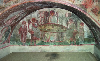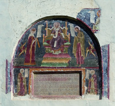 Сохранилось несколько фрагментов первоначальных росписей кафоликона, выполненных после 1602 г. На юж. фасаде церкви, в люнете над ктиторской надписью, расположенной над прежним (ныне заделанным) входом в нартекс, находится обширная композиция «Царский Деисус», к-рая в 3 местах распространяется за пределы люнета. Очевидно, это не живописное оформление архитектурного элемента, а фрагмент более обширной внешней росписи - возможно, целиком покрывавшей фасады церкви. На престоле изображен Христос Царь Царей и Великий Архиерей в изводе, отражающем определенную эволюцию данного иконографического типа, при к-рой царские одеяния и венец заменяются архиерейскими облачениями и митрой. Тем не менее в данном изображении сохранился отголосок царской одежды: омофор продет сзади, затем с правой стороны выходит спереди и перекинут через левую руку на манер ношения царского лора. Подобный тип изображения встречается на иконе (ок. 1500 г.) из ц. мч. Христодула Иоанна Богослова апостола монастыря на Патмосе. Справа и слева Христу предстоят Пресв. Богородица в царском облачении и венце и св. Иоанн Предтеча; за каждой фигурой изображен серафим. Ниже, по обе стороны ктиторской надписи, представлены пророки Аарон и Захария; сверху, над люнетом, видно изображение прав. царя Соломона (фигура прор. Давида с противоположной стороны не сохр.). Все сопроводительные надписи - на церковнослав. языке. На свитках Пресв. Богородицы и св. Иоанна Предтечи помещены молитвы, составленные из неск. источников (вечерняя молитва свт. Антиоха, Пс 87. 3 и др.). На свитке прор. Захарии помещены стихи Зах 1. 16 и 14. 20; на свитке прор. Аарона - отрывок чрезвычайно редко цитируемой на свитках пророков ветхозаветной книги - Левит (10. 9); на свитке царя прор. Соломона - часто встречаемая цитата из Притч (9. 1) (Dragnev. 2020. P. 66-67).