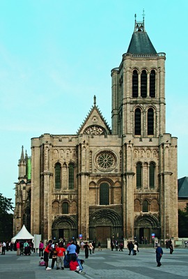 В 1140-1144 гг. с вост. стороны к нефу эпохи Фульрада была пристроена новая апсида с двойным амбулаторием и венцом капелл, считающаяся одним из первых и наиболее выдающихся памятников готической архитектуры. Символическое значение своего проекта перестройки церкви аббат Сугерий объяснил в 2 трактатах («Liber de rebus in administratione sua gestis» и «De consecratione ecclesie sancti Dionisii»). По-видимому, его архитектурный замысел был пронизан неоплатоническими идеями, почерпнутыми из «Ареопагитик», гл. обр. из соч. «О небесной иерархии», а также из комментариев к нему, составленных Гуго Сен-Викторским († 1141). Сугерий считал, что красота - свет, исходящий из божественного источника, а потому созерцание предметов, преображенных светом, дает возможность созерцающему в анагогическом движении вознестись от видимых вещей к невидимым и далее к источнику света - Богу. Чтобы наполнить светом старый неф каролингской эпохи, капеллы новой апсиды были украшены витражами во всю высоту стен, вдоль них фактически шли 2 амбулатория, разделенные 12 колоннами, что увеличивало объем заполняемого светом пространства. Согласно Сугерию, на строительство апсиды, заложенной 14 июля 1140 г., ушло 3 года и 3 месяца; 11 июня 1144 г. она была торжественно освящена. На церемонии присутствовали 19 епископов (в т. ч. архиепископ Кентерберийский Вильгельм Корбейский), а также кор. Людовик VII с супругой Алиенорой Аквитанской и матерью Аделаидой Савойской. Король собственноручно перенес мощи св. Дионисия из крипты, выстроенной во времена аббата Хильдуина, в богато украшенную раку в алтарной части церкви. В последние годы правления Сугерия был выстроен также сев. портал (т. н. портал Валуа), сохранившийся лучше западных, сильно перестроенных позднее. Портал символизирует связь династии Капетингов со св. Дионисием: 6 фигурных колонн на откосах портала изображают первых королей династии, а на тимпане помещен барельеф с изображением мученичества святого.