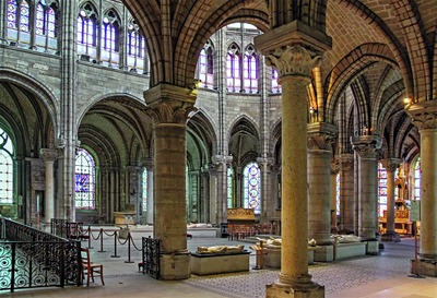 В 1260 г. на хранение в С.-Д. были переданы 3 королевские короны. По замыслу кор. Людовика Святого, церковь должна была стать усыпальницей французских королей всех 3 династий - Меровингов, Каролингов и Капетингов. 12 марта 1264 г. в торжественной обстановке в средокрестье церкви были перезахоронены короли Гуго Капет, Роберт II Благочестивый (996-1031) с супругой Констанцией Арльской († 1032), Генрих I (1027-1060), Людовик VI с сыном Филиппом Молодым († 1131), к-рый умер раньше отца, но тоже носил королевский титул, Констанция Кастильская († 1160) - 2-я жена Людовика VII. В 1265 г. в новый некрополь был перенесен прах кор. Хлодвига II (639-657), Карла Мартелла, кор. Пипина Короткого и его супруги Бертрады († 783), имп. Карла Лысого и его супруги Эрментруды († 869), кор. Карломана I († 771), кор. Карломана II (879-884), кор. Людовика III (879-882). Было изготовлено 16 скульптурных надгробий, к-рые разместили в хронологическом порядке - от самых древних королей на западе к почившим относительно недавно - на востоке. Т. о. некрополь должен был демонстрировать абсолютную преемственность власти франкских и французских королей с момента обращения кор. Хлодвига в христианство: идея, давно существовавшая в умах королевских правоведов, была наглядно представлена в устройстве королевской усыпальницы. Тогда же по заказу кор. Людовика Святого был создан и склеп Дагоберта I. Украшавшие его барельефы изображали описанные в «Деяниях Дагоберта» сцены спасения св. Дионисием души короля, считавшегося основателем аббатства. Кор. Людовик Святой хотел, чтобы в средокрестье покоились исключительно коронованные особы, однако наказ был нарушен уже его сыном, кор. Филиппом III Смелым (1270-1285), сразу после гибели Людовика Святого в 9-м крестовом походе (1270). Филипп III распорядился похоронить рядом c королями своих родственников, участвовавших в крестовом походе, а также своих приближенных.