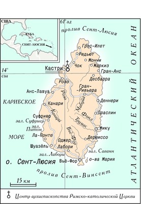 [англ. Saint Lucia], гос-во в Вест-Индии, в центральной части М. Антильских о-вов (группа Наветренные о-ва). Занимает о-в Сент-Люсия. Территория 616 кв. км. Столица - Кастри (4 тыс. чел., с пригородами - 22 тыс. чел.; перепись 2010 г.). Офиц. язык - английский. Абсолютное большинство жителей владеют также антильским франко-креольским языком. Административно-территориальное деление: 11 округов (district). С.-Л.- члeн ООН (1979), Содружества (1979), МВФ (1979), МБРР (1980), ОАГ (1979), Сообщества стран Карибского бассейна (КАРИКОМ; 1974), ВТО (1995), Международной организации Франкофонии (1981). География. Расположено на острове вулканического происхождения. Омывается с запада Карибским м., с востока - Атлантическим океаном. Максимальная протяженность с севера на юг 43 км, с запада на восток 22 км. Береговая линия на востоке, севере и северо-западе сильно изрезана многочисленными заливами и бухтами. Рельеф гористый, высоты до 950 м (высшая точка страны - гора Жими на юго-западе острова). В кальдере Калибу встречаются термальные источники. Вдоль побережья - полоса низменности. Климат тропический, пассатный. Среднемесячная температура 24-26°C. Осадков выпадает от 150 мм в год на севере до 2500-3500 мм на склонах горы Жими, наибольшее их количество - с мая по авг. С июля по нояб. часты тропические ураганы. На территории С.-Л. много небольших рек. В растительном покрове преобладают вечнозеленые тропические леса. Фауна острова представлена в основном птицами, грызунами, пресмыкающимися, имеется неск. видов эндемичных пресмыкающихся и птиц, в т. ч. синелицый амазон, считающийся одним из национальных символов. Природные резерваты, в т. ч. охраняемый природный район Питон, включены в список Всемирного наследия ЮНЕСКО (2004).