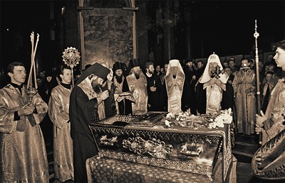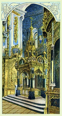 Пещерный храм являлся местом молитвы царской семьи. В его юж. части при алтаре была устроена отдельная небольшая моленная для имп. мц. Александры Феодоровны. В ней находились реликвии из Сарова, а также иконы - С. в молении на камне, С. кормит медведя (последняя была написана на доске от кельи преподобного). Особенно много свечей возжигалось у находившегося в юж. части местного ряда иконостаса образа С. в молении на камне (ныне - ГМИР). Здесь обычно стояла царская семья во время богослужения. На аналое в этой же части храма находилась икона преподобного с частицами его св. мощей, прядями волос и мантии (Ломан Д. Н. Пояснительная записка капитана по оборудованию ц. прп. Серафима Саровского чудотворца при Собственном Его Имп. Величества Сводном пехотном полку в г. Царском Селе. СПб., 1912. Ил. между с. 18 и 19). Дарохранительница на престоле Пещерного храма (дар Саровской обители) имела вид сени над ракой со св. мощами С. в Успенском соборе Саровского мон-ря. В храме находился ковчег с частицей мощей святого. Внутреннее убранство Пещерного храма, как и формы Феодоровского собора, возрождали традиции церковного искусства Др. Руси. В соборе было много древних икон, новые было поручено писать московскому иконописцу Н. С. Емельянову (возможно, его кисти принадлежит и образ «Моление на камне» из местного ряда иконостаса).