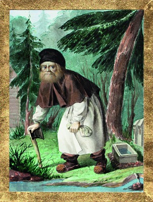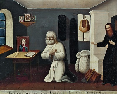 «Прп. Серафим на пути в пустыньку» - сюжет, хорошо известный в XIX в., также присутствует в иконах. На одной из таких икон на обороте имеется штамп с надписью об ее освящении на св. мощах С. (ЦМиАР).