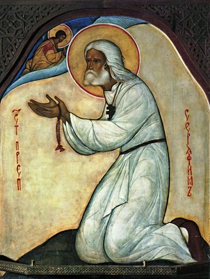 Образ С. по-новому был осмыслен иконописцем русского зарубежья XX в. иноком Григорием (Кругом). Икона преподобного в молении на камне написана им в 1959 г. для ц. во имя Серафима Саровского бывш. детского приюта С. М. Зёрновой в Монжероне, Франция (Tregubov А. The Light of Christ: Iconography of G. Kroug. Crestwood, 1990. Р. 38-39). Большая фигура коленопреклоненного святого в белых одеждах приближена к Христу, нимб С. соприкасается с нимбом Спасителя. Руки святого в виде чаши простерты в молении, принимая исходящее от Христа благословение. Небольшой образ преподобного в клобуке и мантии, с лестовкой в правой руке был написан в 1960 г. (мон-рь св. Иоанна Предтечи, Дума - Эль-Батрун, Ливан) (Григорий (Круг), инок. Мысли об иконе / Сост.: О. Круг, А. Богенгарт. P., 1978. С. 139. Ил., 163. № 103). С. предстает как древний святой: его лик пронизан светом преображенной человеческой плоти, фон - белый.