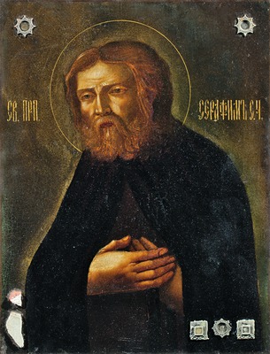 В кон. XIX в. образ С. получил распространение в изделиях из металла, в частности на изображениях праведной кончины святого сокращенного извода (латунный образок с иконой Божией Матери «Умиление» на обороте, ЦИМ СДМ), на прямоугольной иконе с 4 клеймами жития: явление Богоматери С. в день Благовещения, С. на пути в пустыньку, С. в молении на камне, праведная кончина С. (ЦМиАР). Основными отличиями образов святого XIX в. служат отсутствие нимба и слово «отец» или «старец» рядом с именем С. (при наличии надписи).