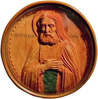 После 1903 г. реликвии С. вкладывались в ковчежцы мн. икон с образом преподобного. В Москве ок. 1903 г. фирмой Ф. Я. Мишукова для реликвий С. был изготовлен хранившийся в Александровском дворце Царского Села деревянный, обложенный серебром и украшенный жемчугом и сапфирами складень-ларец, принадлежавший царской семье (ГЭ; см.: Синай. Византия. Русь. 2000). В ковчеге правой створы складня вверху хранились засушенные цветы из Сарова (частично сохр. под слюдой), а также, как следует из архивного описания, скуфья святого. На левой внутренней створе складня в обрамлении - живописное изображение благословляющего С. в рост, с большим медным крестом. В дни ссылки в Тобольск у имп. мц. Александры Феодоровны находилась «шапка» (видимо, скуфья) преподобного, о чем известно из ее письма от 2/15 янв. 1918 г. к М. М. Сыробоярской (ГАРФ. Ф. 601. Оп. 2. Д. 77. Л. 1-3, копия).