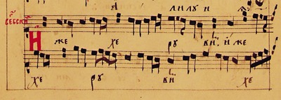 Херувимская песнь сербского распева (начало). Ирмологион Жировицкого монастыря. 20–40-е гг. ХVII в. (НБУВ. Ф. 1. № 3367. Л. 21 об.) (сербский напев), свод традиц. монодийных напевов серб. происхождения и их позднейшие гармонизации и переложения. Монодийные песнопения с надписаниями «сербское», «сербский» впервые стали известны по белорусским и украинским