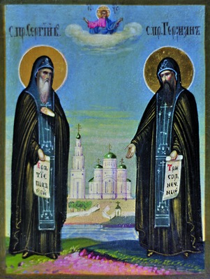 Впосл. образно-символическое решение изображений С. и Г. в иконописи усиливается за счет повышенного внимания к постановке фигур и сокращения подробностей ландшафта по сравнению с рисунком (остаются лестница, ведущая к вершине горы, монастырские врата и церковь); акцентируются обращенные к Богу взгляды праведников. Цельная, детально продуманная иконография парного изображения С. и Г. многократно повторена на иконах с подписью самого Пешехонова, в произведениях, выполненных в его мастерской в С.-Петербурге и вышедших из валаамской иконописной мастерской, к-рые подписывались как «Труды валаамских иноков». Примеры тому - иконы Пешехонова 1865 г. из Валаамского монастыря (возвращена на Валаам из ц. свт. Николая Чудотворца в Сортавале), икона и хоругвь (на лицевой стороне - Успение Пресв. Богородицы) 1872 г. из валаамской ц. апостолов Петра и Павла (Преображенский собор Нововалаамского мон-ря), 1872 г. из валаамской ц. Коневской иконы Божией Матери (в алтаре Преображенского собора Нововалаамского мон-ря) и др. В монастырских описях есть упоминания о вышедших из употребления произведениях, напр. об иконописной хоругви «Успение Богородицы. Преподобные Сергий и Герман Валаамские» 1854 г. из Преображенского собора обители (опись 1864 г.- АФВМ. Go: 4/1. № 83).