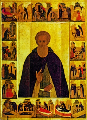 Отдельной темой является изображение рус. святых с С. Р. в житийных клеймах. Образ троицкого игумена появляется словно внутри рус. истории, связывая между собой события и личности. Уже на рубеже XV и XVI вв. на житийных иконах свт. Алексия, митр. Московского, преподобных Кирилла Белозерского и Димитрия Прилуцкого образ С. Р. является воплощением общерус. святости - безупречной смиренности, мудрости и кротости. Такие иконы помещали на раках с мощами святых (нагробные образы) и рядом с ними или в правой части местного ряда иконостаса, где обычно располагались храмовые и чтимые иконы.