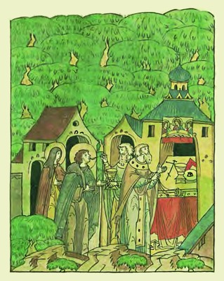 При вел. кн. Иоанне III, с именем которого связывают начало формирования единого общерус. гос-ва, житийные образы имели большое значение в творчестве ведущего столичного иконописца Дионисия и художников его круга, создавших ряд изображений рус. подвижников в циклах жития. На иконе работы Дионисия «Прп. Димитрий Прилуцкий, с житием» (ок. 1503, ВГИАХМЗ) из Спасского собора Спасо-Прилуцкого мон-ря клеймо «Беседа преподобного Димитрия с преподобным Сергием Радонежским» восходит к композиции ранней житийной иконы Радонежского чудотворца «Святый Сергий уверяет некоего земледельца» (Дионисий «Живописец пресловущий». 2002. С. 152-154. Кат. 35). Древнейшая икона прп. Кирилла Белозерского со сценами жития работы Дионисия и мастерской (нач. XVI в., ГРМ), в основу иконографии к-рой положена пространная редакция Жития прп. Кирилла Белозерского, также содержит сцену «Прп. Сергий Радонежский беседует с прп. Кириллом Белозерским» (Там же. С. 160-162. Кат. 38). Предназначавшаяся для иконы одноименная шитая пелена вклада вел. кн. Василия III и вел. кнг. Соломонии в Успенский собор Кириллова Белозерского мон-ря (?) в 1514-1525 гг. имеет аналогичную сцену (Маясова. 2004. С. 29). Как вариант рассматриваемого сюжета можно назвать композицию «Прп. Сергий Радонежский беседует с прп. Кириллом Белозерским в «хлебне» Симонова монастыря» (клеймо 7) на иконе «Преподобные Кирилл Белозерский и Кирилл Александрийский, с житием прп. Кирилла Белозерского» (2-я пол. XVI в., ГТГ; см.: 1000-летие рус. худож. культуры. 1988. С. 343. Кат. 98). На житийных иконах свт. Алексия, митр. Московского, близкий по композиции сюжет носит наименование «Митр. Алексий просит прп. Сергия отпустить его ученика Андроника на игуменство в основанный митрополитом Спасский монастырь» (икона ок. 1481 г. из Успенского собора Московского Кремля (ГТГ); см.: Дионисий «Живописец пресловущий». 2002. С. 88-91. Кат. 3; икона кон. XVI в., вклад С. А. и М. Я. Строгановых в Благовещенский собор Сольвычегодска (Сокровища Сольвычегодска. 2010. С. 29)).