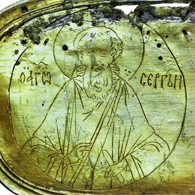 Поясные изображения С. Р. часто встречаются в произведениях богослужебного и церковного назначения: на крестах и литургических сосудах, церковных тканях, священнических облачениях и митрах, основная часть к-рых была изготовлена для Троице-Сергиева мон-ря. Несмотря на общую однотипность, изображения на драгоценных дробницах имеют особенности, что позволяет говорить о наличии разных иконографических источников. На золотых дробницах «Жемчужной пелены» 1599 г. (СПГИАХМЗ), вклада царя Бориса Годунова, и покрова «Крест на Голгофе» (1-я четв. XVII в., СПГИАХМЗ; см.: Там же. С. 217), вклада царевича Феодора Борисовича, у С. Р. крупные черты лика, объемные волосы. На дробнице золотого напрестольного креста-мощевика (ок. 1637 (?), СПГИАХМЗ; см.: Там же. С. 218-219), изготовленного московским серебряником Андреем Маловым, указательный палец левой руки со свитком спрямлен, что встречается в памятниках нач. XVI в., черты лика мелкие. На золотой с финифтью дробнице архимандричьей шапки (1647-1822, СПГИАХМЗ; см.: Там же. С. 228-229), вложенной в Троицкий мон-рь боярином И. Б. Репниным, правая рука С. Р. с раскрытой вовне ладонью находится на уровне груди.