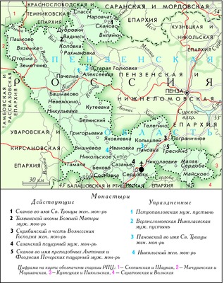 Упраздненные в XVIII в.Верхнеломовская Петропавловская пуст. (мужская, близ с. Алексеевка Пачелмского р-на, основана на рубеже XVII и XVIII вв., в 1756 приписана к нижнеломовскому Богородице-Казанскому мон-рю, в 1764 упразднена); Наровчатский Димитриевский мон-рь (женский, в с. Наровчат или близ него, упом. с 1710, упразднен в 1764); Наровчатская Спасо-Преображенская пуст. (мужская, в с. Наровчат или близ него, упом. с 1727, упразднена в 1764 или ранее); Верхнеломовская Николаевская пуст. (мужская, близ с. Ст. Толковка Пачелмского р-на, упом. в 1739-1749, упразднена между 1749 и 1764).