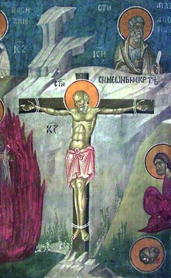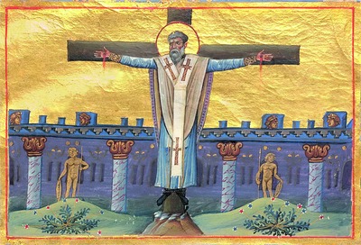 Иконография С. представлена 2 типами: сценой мучения и единоличным образом (в рост или по пояс). Одной из ранних является миниатюра в Минологии имп. Василия II (Vat. gr. 1613. P. 46, 1-я четв. XI в.) с изображением распятия святого. Крест утвержден на небольшой горке по центру композиции. Ноги С. привязаны к стволу креста веревкой, руки растянуты почти параллельно поперечной перекладине, ладони пригвождены, из ран льется кровь. Святой (с нимбом) висит на кресте в полном богослужебном облачении: на нем голубовато-серый подризник с охристыми орнаментированными поручами, охристая фелонь отделана по внутреннему краю лиловой полосой, омофор Y-образной формы. По облику С.- седой муж с клиновидной бородой средней длины, черты лица крупные. Позади креста - сиренево-сине-голубая стена с колоннами, к-рая делит по горизонтали композицию пополам: на горнюю - на сплошном золотом фоне и на дольнюю - с линией позема с редкими кустикам и цветами внизу. Своеобразными «свидетелями» мученичества С. стали 2 обнаженные скульптурные фигуры кумиров с копьями и со щитами и личины на стене. На миниатюре в Минологии на год с циклами двунадесятых праздников и Жития вмч. Димитрия Солунского (Bodl. gr. theol. f. 1. Fol. 10r, 1322-1340 гг., Фессалоника) также представлено распятие святого, но в характерной для этой рукописи беглой, эскизной манере. В настенных минеях в росписи ц. вмч. Георгия в Старо-Нагоричино (1317/18) и в ц. Успения Пресв. Богородицы мон-ря Грачаница (ок. 1320) С. представлен дважды: под 18 сент.- погрудно и под 27 апр.- распятым на кресте. Из одежды на святом только перевязь по бедрам, руки и ноги привязаны к перекладинам веревкой; у С. недлинная вьющаяся борода с проседью и вьющиеся же волосы (см.: Миjовић. Менолог. С. 277. Слике 79). В минейном цикле в притворе ц. Вознесения мон-ря Дечаны (ок. 1350) образ С. встречается трижды: под 18 сент. помещены сцена его распятия и редкое изображение святого, лежащего в саркофаге. Как и на фресках в Старо-Нагоричино и в Грачанице в сцене распятия, С. показан с прикрытыми чреслами, но руки и ноги пригвождены, а не привязаны к кресту. Рядом с распятием, справа, 2 фигуры воинов, один из них указывает перстом на мученика. У подножия креста стоит саркофаг, в к-ром покоится тело С., облаченного в архиерейские одежды, на груди лежит Евангелие, вложенное в скрытые фелонью руки. В этой композиции оба раза у С. темные волосы и борода (короткая, окладистая) с незначительной проседью (см.: Там же. С. 318. Слике 215). Еще одно распятие С. представлено под 27 апр. (см.: Там же. С. 338. Схема 50).
