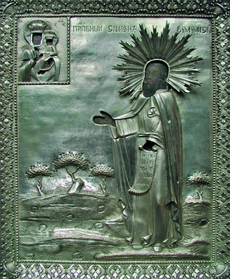 Рубежом XVIII и XIX вв. датируется большая икона С. (под записью) из ц. свт. Николая Чудотворца во Владычной слободе в Вологде (доска имеет 3-лопастное завершение и лучковую выемку внизу; см.: Там же. С. 8, 14. Примеч. 16. Прил. 2. Рис. 4). Святой показан в рост на фоне холмистого позема. На С. коричневая ряса, темная мантия и зеленая епитрахиль; у него слегка волнистые до плеч волосы и длинная седая борода; руки на уровне груди, правой благословляет, в левой держит четки.