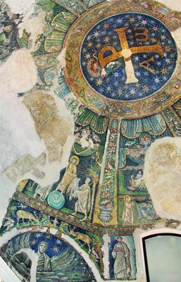 Мозаики подкупольного пространства баптистерия Сан-Джованни-ин-Фонте. 2-я пол.— 3-я четв. V в. Фото: И. А. Орецкая [Итал. San Giovanni in Fonte, др. название - Неаполитанский баптистерий], баптистерий (IV-V вв.), часть архитектурного комплекса кафедрального собора г. Неаполя Сан-Дженнаро (cв. Ианнуария, XIV в.). Представляет собой небольшое, прямоугольное в плане сооружение с куполом, примыкающее к правому нефу базилики Санта-Реститута (св. Реституты, V в.).
