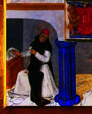 Скапуляр в облачении католич. св. Бернарда Клервосского. Фрагмент композиции «Искушение Бернарда Клервосского дьяволом». Миниатюра из Часослова Этьена Шевалье. Ок. 1555 г. Худож. Жан Фуке (Музей Конде. Ms 71)