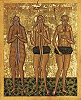 Преподобные Макарий Египетский, Онуфрий Великий и Петр Афонский. Оборотная сторона иконы-таблетки «Сошествие Св. Духа на апостолов». Кон. XV в. (НГОМЗ). Фото: Иконы Вел. Новгорода XI — нач. XVI вв. М., 2008