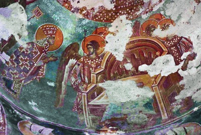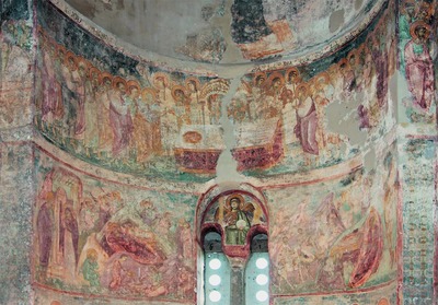 Своды и верхние части стен посвящены жизни Христа и Богоматери, праздничному циклу отведены 3 малых полукупола - южный, северный и западный, а также широкие подпружные арки над ними. В сев. конхе - «Рождество Христово». К каждому полукуполу примыкает арка, к-рая вмещает 4 композиции. Дополнительные сюжеты сочетаются с «Воскресением - Сошествием во ад» в юж. конхе как с частью Страстного цикла, а «Сошествие Св. Духа» завершает собой Пасхальный цикл. «Успение Богоматери» на западе окружено сюжетами из цикла «Рождество Пресв. Богородицы». На малых подпружных арках - медальоны с изображениями апостолов от 70. Под конхами, в зоне хор, разворачиваются сцены Сотворения мира и начального этапа истории человечества, с ними соседствуют в простенках прообразовательные сюжеты, а также чудеса Христовы. На колоннах в центральной части храма помещены поясные изображения столпников, между колоннами вписаны ростовые фигуры св. воинов и преподобных.
