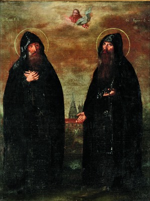В 90-х гг. XVIII - нач. XIX в. традиция изображения преподобных развивалась под воздействием распространявшихся приемов академической живописи. Важным произведением стала икона из местного ряда Преображенского собора Валаамского мон-ря (авторская живопись находится под поздней записью, оклад 1854 г., Нововалаамский мон-рь; см.: Там же. С. 376, 606-607. Кат. 64). Святые, облаченные в черные мантии и округлые схимнические куколи, предстоят Спасу Нерукотворному, между ними видны монастырские сооружения. У С. ладони молитвенно сложены у груди, у Г. руки приподняты в вопрошающем жесте. Возможно, мастера ориентировались на образцы из Киево-Печерской лавры и Саровского мон-ря, подвижники к-рых изображались в куколях.