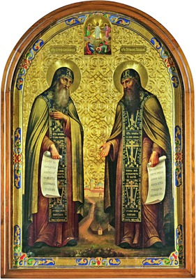 Каменное строительство в Валаамском мон-ре, начавшееся в 80-х гг. XVIII в., вызвало пристальное внимание не только к самой обители, но и к иконографии ее основателей. Разрабатывалась композиция парного изображения С. и Г. Одна из ранних сохранившихся икон с образами преподобных, 1786 г., происходит из местного ряда иконостаса Успенской ц. Валаамского мон-ря (часовня прор. Илии в Соткуме, Финляндия; см.: Сипола. 2019. С. 207-210, 546-547. Кат. 26). Преподобные представлены в повороте друг к другу, с непокрытыми головами, в рясах и мантиях, их облик соответствует текстам подлинников, вверху - благословляющий Господь Вседержитель. Святые отличаются внешним видом, возрастом, жестами. С. ниже ростом, у него короткие волосы и продолговатая седая борода средней длины, левая рука с указующим перстом поднята к груди, в правой - свиток. У Г. короткие волосы и длинная, более узкая на конце борода с проседью, правая рука обращена к С., в левой, приподнятой руке - свиток.