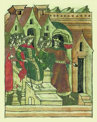Вел. жупан Стефан Неманя оставляет престол сыну Стефану. Миниатюра из Лицевого летописного свода. 70-е гг. XVI в. (РНБ. F.IV.233. Л. 556 об.)