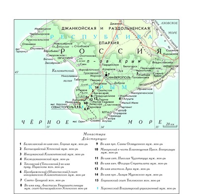 инкерманский Климентовский (мужской, в г. Инкермане в составе Балаклавского р-на Севастополя, основан в VIII-XV вв., восстановлен в 1850, упразднен в 1926, возрожден в 90-х гг. XX в.), бахчисарайский Успенский (мужской, близ г. Бахчисарая, основан между XI и XV вв. на месте явления на скале Бахчисарайской иконы Божией Матери, восстановлен в 1849-1850, упразднен в 1921, возобновлен в 1991), Балаклавский во имя великомученика Георгия Победоносца (мужской, близ Севастополя, известен с 1578, упразднен в 1929, возрожден в 1993-1994), Космодамиановский (мужской, под Алуштой, основан в 1853-1856 как киновия бахчисарайского Успенского скита, упразднен в 1923, возрожден в 1992), Топловский (Тополёвский) во имя прмц. Параскевы (женский, в с. Учебном Белогорского р-на, основан в 1864, закрыт в 1923, возрожден в 1992-1993), Преображенский (Новоспасский) скит инкерманского Климентовского монастыря (мужской, на горе Шулдан близ с. Терновка Балаклавского р-на Севастополя, создан в 1996), Свято-Троицкий (женский, в Симферополе, основан в 2003), во имя вмц. Анастасии Узорешительницы скит бахчисарайского Успенского мон-ря (мужской, в урочище Качи-Кальон близ с. Предущельного Бахчисарайского р-на, создан в 2005), во имя прп. Саввы Освященного (мужской, в урочище Челтер-Мармара близ с. Терновка, основан в 2009), в честь иконы Божией Матери Корсунская (Георгиевский) скит Топловского мон-ря (женский, на Сапун-горе в Балаклавском р-не, Севастополь, создан 24 нояб. 2009 решением Синода УПЦ как жен. мон-рь, 3 апр. 2012 передан Топловскому мон-рю для устройства скита), Луки апостола (мужской, на месте бывш. с. Горянка (Лаки) Бахчисарайского р-на, основан 24 нояб. 2009), Мангупский в честь Благовещения Пресвятой Богородицы (мужской, на горе Мангуп близ с. Залесного Бахчисарайского р-на, основан 23 дек. 2010), Николая Чудотворца, святителя (мужской, в с. Холмовка Бахчисарайского р-на, основан в 2010), Феодора Стратилата, великомученика (мужской, в урочище Челтер-Коба близ с. М. Садовое Бахчисарайского р-на, основан в 2011), Лазаря Муромского, преподобного (мужской, близ пещерного городища Бакла, рядом с с. Скалистым Бахчисарайского р-на, основан 25 сент. 2013).