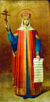 я». Этот же извод повторяется на большой живописной иконе 2-й пол. XIX в. в отдельно стоящем киоте в сев.-зап. части четверика Благовещенской ц. У св. княгини красивое округлое лицо с правильными чертами, белый плат скреплен фибулой, закрытый венец с городчатым ободом украшен драгоценными камнями, поверх синего платья одет красный плащ с охристой каймой и жемчужной отделкой, в правой руке - большой крест, на свитке надпись: «