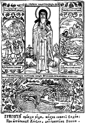 Описание восходит к одному из ранних сохранившихся изображений Г. из цикла гравюр на дереве 1655-1660 гг. работы мастера Илии для печатного издания Киево-Печерского Патерика 1661 г. (Патерик, или Отечник Печерский… К., 1661. Л. 173). Композиция гравюры строится по принципу житийной иконы. В среднике на фоне условной архитектуры, горок и позема с травами помещено ростовое фронтальное изображение святого в монашеском одеянии (параман с 2 крестами) и в куколе, без обуви. Г. представлен старцем с небольшой белой бородой, ладонь правой руки раскрыта перед грудью, в левой - Евангелие, вверху надпись: «С Григорий чудотворец Печер». На клеймах по сторонам центрального изображения и под ним в овальных рамах - 3 сюжета Жития Г. (чудеса и мученическая кончина). Слева - 3 вора с награбленным, застывшие на месте по молитве святого, и чудотворец вдали у храма (надпись: «Злодее стояху два дни з мехами овощи»). Справа - Г. склонился над внезапно уснувшими ворами (надпись: «Злодее спали пять нощий дондеже Григорие прииде»). Внизу - кн. Ростислав Всеволодович и воины его дружины, по приказу бросающие святого в Днепр (надпись: «Григорий от князя Ростислава в воде утоплен привязавше камень»). В соответствии с традициями барокко гравюра снабжена также стихотворной подписью: «Григорий правды ради, жизнь сконча водою. При источнице жизни, днесь причтен покою».