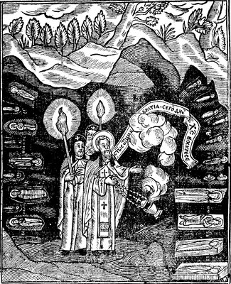 Композиция повторена Леонтием Тарасевичем на гравюре для издания патерика 1702 г., где художником привнесен дополнительный мотив небесного света, на переднем плане помещена горящая лампада. Д. облачен в фелонь, что подчеркивает его сан.