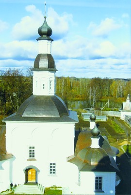 В писцовой книге 1626/27 г. упоминаются также 2 др. храма. Это ц. в честь Богоявления, «каменна на потклете теплая с трапезою да с келарскою и та церковь развалилась. А в ней образов и всяково строения нет». Под трапезной храма размещались хозяйственные помещения. Очевидно, после Смутного времени ветхий храм был разобран либо перестроен под хозяйственные нужды братии.