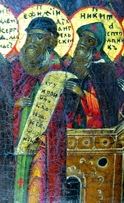 Первая икона Е. была написана после освидетельствования его мощей. Очевидно, уже тогда существовала традиция изображения преподобного с двуперстием. Сохранилось описание ранней иконы Е. (в надписи назван «новым чудотворцем»), в 1914 г. находившейся в архангельском во имя арх. Михаила муж. мон-ре: «Согласно с сказаниями о явлениях преподобного разным лицам, он изображен «великий ростом, с большою бородою, в монашеской мантии и епитрахили»: правая рука его простертая, несколько отклоненная в сторону (в молитвенном положении, а не для благословения), имеет двуперстное сложение, а левая держит и жезл игуменский и свиток. В таком изображении нельзя не видеть тенденциозного намерения изобразить прославленного угодника времени патриарха Иосифа: очевидно естественнее было изобразить святого настоятеля монастыря с жезлом в одной руке и свитком - в другой, между тем удержав эти два иконописные атрибута преподобнаго в левой руке (что совсем неудобно), правую, приподнятую вверх, в отклоненном положении изобразил так, что трудно понять - молитвенное положение руки он имел в виду или для благословения; но изображение говорит более в пользу первого» (Кириллов А. В. Мон-рь св. архистратига Михаила в г. Архангельске: (Церк.-ист. очерк). Архангельск, 1914. С. 47).