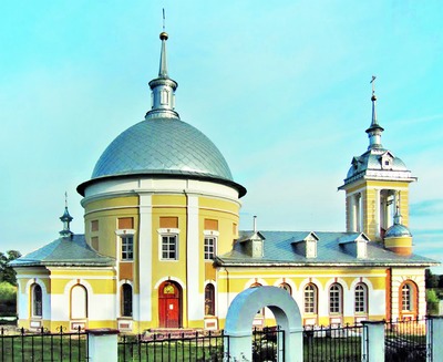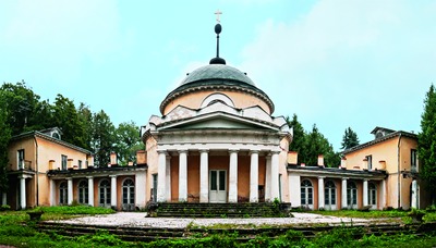 В период раннего ампира еще актуальна была тема храмов-ротонд - отголосок предыдущей эпохи. В строительстве усадебных мавзолеев Жилярди обращался к ротондам, трактованным преувеличенно монументально, в стиле Пантеона (ротонда с колонным портиком и низким куполом): ц. свт. Димитрия Ростовского в усадьбе Суханово близ г. Видное Ленинского района (1813, мавзолей Д. П. Волконского, заказчица Е. А. Волконская; перестроена в 30-х гг. XX в.) изначально с полукруглой колоннадой позади, соединенной с колокольней по оси храма и симметричными корпусами богадельни; Успенская ц. в усадьбе Семёновское-Отрада Ступинского района (1832-1835, заказчик В. Г. Орлов). О. И. Бове развивал уже традиционную для Москвы форму ротонд, включенных в 3-частную композицию. Архитектор выстроил в своей усадьбе величественную ротонду с наружной колоннадой из сдвоенных колонн, трапезной и колокольней (ц. арх. Михаила в Архангельском Рузского городского окр., 1822), а затем повторил этот проект в Покровской ц. в Пехра-Покровском городского окр. Балашиха (1825-1828; трапезная перестроена).