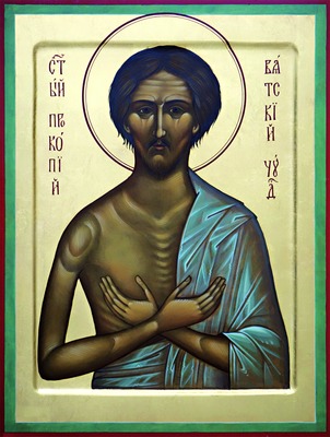 Ранняя сохранившаяся икона кон. XVII - нач. XVIII в. (Вятский худож. музей им. В. М. и А. М. Васнецовых - далее ВХМ) находилась в верхочепецком Крестовоздвиженском монастыре, в 1775 г. была перенесена в слободской Богоявленский (Крестовоздвиженский) мон-рь в ц. во имя арх. Михаила. На иконе П. полностью обнажен («…и одежды никогда на себе ношаше, но хождаше бос и наг…»; см.: Жизнь. 1888. С. 41), с выступающими ребрами, изображен справа, лицом к прп. Трифону, оба - в молении образу Божией Матери «Воплощение». У П.- взлохмаченные волосы и короткая борода, лик с крупными чертами, морщинами на лбу.