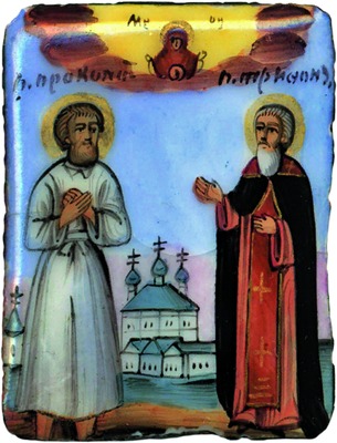 Ареал распространения изображений П. ограничивается в основном территорией бывш. Вятской епархии (учреждена в окт. 1657). Иконография отражает принадлежность П. к категории русских юродивых, мирян из простого сословия. Церковным преданием она неразрывно связана с почитанием старшего современника блаженного - прп. Трифона Вятского (считается, что прп. Трифон, излечив П. в юности, благословил его на юродство). Известно посмертное чудо 3 марта 1666 г.: жительнице Слободского у., девице Марфе Тимофеевой Пушкарёвой, после молитвы в Успенском Трифоновом муж. мон-ре, где покоятся мощи святых, явились 2 «святолепных» мужа, они называли друг друга Трифоном и Прокопием и обещали исцеление, которое Марфа получила в скором времени (Жизнь. 1888. С. 45; Осокин. 1912. С. 7; Иванов С. А. Житие Прокопия Вятского. Edito princeps // Florilegium: К 60-летию Б. Н. Флори / Сост.: А. А. Турилов. М., 2000. С. 79-80). Совместное изображение прп. Трифона и П. (первых подвижников, прославленных в лике местночтимых святых Вятской епархии) - наиболее распространенная устойчивая иконография широкого круга памятников, в т. ч. иконы из Благовещенской ц. Трифонова мон-ря, которую носили крестным ходом по губернии (Васильев С., Бехтерев Н. История Вятского края с древних времен до нач. XIX ст. Вятка, 1870. Т. 1. С. 191, 250).