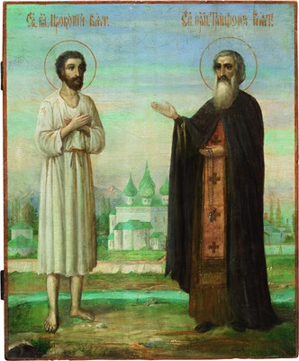 В XIX в. эта иконография развивалась по пути насыщения повествовательными подробностями: со временем вместо лаконичного позема на иконах появились пейзажи с р. Вяткой и видами Трифонова мон-ря (обычно с сев.-вост. стороны, как на иконе 2-й пол. XIX в., ВХМ). Расположение фигуры П. в этих композициях варьировалось, в т. ч. и на «раздаточных» паломнических образках (кон. XIX в., частное собрание, Вятка). Изменились одеяния и жесты П.: он изображен в небольшом повороте к центру, в длинной белой рубахе с препоясанием, руки, как правило, сложены крестообразно на груди, иногда развернуты ладонями. Иконы святых создавались в городских и монастырских мастерских местными и приезжими иконописцами, были привозными (кон. XIX - нач. XX в., ВХМ, Сарапульский ист.-архит. и худож. музей-заповедник, собор вмц. Екатерины в г. Слободском, деревянная ц. арх. Михаила в г. Слободском (бывш. проездная башня мон-ря), ц. Св. Троицы в с. Волкове Слободского р-на Кировской обл., частные собрания). На иконе из Троицкой ц. в с. Быстрица (Оричевский р-н Кировской обл.) в верхней части изображен Спаситель, а не образ Божией Матери «Знамение». Мстёрская икона кон. XIX - нач. ХХ в. (Кировский обл. краевед. музей) находилась в старообрядческой молельне Вятки. Прп. Трифон и П. представлены прямолично на темном лаконичном фоне с поземом, вверху - Господь Вседержитель. На юродивом - зеленоватое рубище, перекинутое через левую руку, к-рое оставляет обнаженным верхнюю часть тела, подчеркивая его аскетичную худобу. П.- средовек с копной густых вьющихся волос и разделенной на неск. прядей короткой русой бородой. Зимой 1904 г. образ Вятских святых был поднесен мц. имп. Александре Феодоровне (Кедрова С. Н. Христорождественский жен. мон-рь в г. Слободском, Вятской епархии // Вятские ЕВ. 1905. № 6. Отд. неофиц. С. 354-355). Получили распространение литографии (с раскраской, 1883, мастерская ТСЛ, СПГИАХМЗ) и хромолитографии, изготовленные в московской мастерской И. Е. Ефимова на Б. Якиманке (1893). Печатные иконы прп. Трифона и П. вместе с Житиями распространялись во время крестных ходов (Осокин. 1912. С. 41-42), их изображения участвовали в юбилейных торжествах 1912 г. (300-летие. 1912. С. 11).