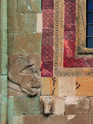 Обрамление окна вост. фасада. Орнаментальный наличник (XI в.). Ангел (XI в.). Голова быка (ок. 500). Фото: Н. Н. Крашенинникова