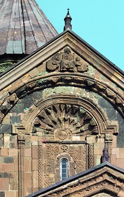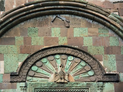 Пространство над наличником заполняют радиальные лучи, раскрытые в виде веера. Центр отмечен 8-лепестковой розеткой, помещенной в плетеную раму. Венчает композицию большой профилированный архивольт. Веерообразная композиция с 2-цветными лучами, безусловно, является излюбленным мотивом зодчего С. Она использована для оформления центральных частей вост., юж. и сев. фасадов. Композиция берет начало из архитектуры Юго-Зап. Грузии, где встречается в украшении церквей Кларджети и Тао с 60-х гг. X в.: лучи выведены на плоскости фасада кладкой камней, полихромный эффект достигается или окраской (Долискана, Ошки, Отхтаэклесиа), или естественным цветом камня (Хахули). Также варианты этого мотива встречаются в интерьерах церквей на парусах (Хахули, Ошки, Эни-Рабати). Очевидно, Арсукисдзе был вдохновлен тао-кларджетскими образцами и творчески переработал их, перенеся композицию на фасады и обогатив дополнительными деталями.