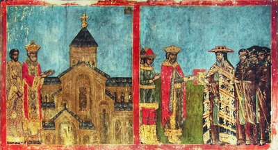 Католикос-патриарх (Николай IX (?)) перед Светицховели. Царь Мириан и духовенство — крестители грузин. Роспись вост. стены Животворящего Столпа. 1687–1688 гг. Ма-стер Г. Гулджаварашвили. Фото: Н. Н. Крашенинникова