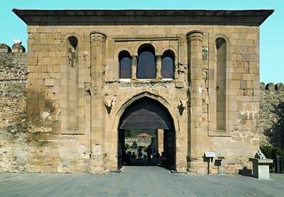 В XI в. двор С. был огражден. В зап. часть ограды включены 2-этажные врата, возведенные по приказу свт. Мелхиседека I сразу после окончания строительства собора в 1029 г. Фасады ворот облицованы тесаным песчаным камнем. На 1-м этаже устроены широкий арочный вход и комнаты с обеих сторон (каждая 22 кв. м). На 2-м этаже расположен большой зал (70 кв. м), к-рый открывается с зап. стороны 3 арками,- на фасаде это сооружение окружает профилированная рама. Над арками, на верхней полосе рамы, высечена надпись, в к-рой упоминается свт. Мелхиседек I. По сторонам от входной арки симметрично вставлены высеченные из зеленовато-белого камня горельефные головы быков (копии; подлинники находятся в Национальном музее Грузии). Вход и 3-арочное сооружение над ним по всей высоте фасада фланкируют массивные граненые пилоны, верхнюю часть которых украшают ряды полудисков. В 1964-1965 гг. были проведены реставрационные и консервационные работы (под рук. Н. Г. Чубинашвили и Цинцадзе; главный консультант Г. Н. Чубинашвили), в ходе которых врата, бóльшая часть которых к тому времени находилась под землей, были воссозданы в первозданном виде.