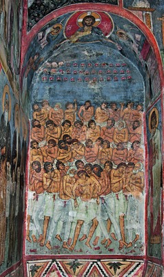 Композиция сцен со страданием С. м. в монументальном искусстве могла приобретать вид цикла, будучи размещенной в жертвеннике, как, напр., в соборе Св. Софии в Охриде (1037-1056; Толстая. 1998. С. 125; Джурич. 2000. С. 28); возможно, в том же месте размещалась фреска с их образами в церкви, посвященной мч. Леонтию, из числа С. м., в Водоче, Македония, 1-я пол. XII в. (сохр. в копии, Национальный археологический ин-т и музей, София: Джурич. 2000. С. 34). В Св. Софии Охридской стены ниши занимают фигуры воинов, разделенные на 2 группы окном, а конху апсиды - поясной образ Спасителя с 2 венцами в руках. В Св. Софии Киевской кроме размещения на подпружных арках образы С. м. находятся на фреске юж. стены помещения в юго-зап. галерее, к-рая по одной версии служила т. н. крещальней, по другой - имела поминальное значение (Попова, Сарабьянов. 2017. С. 102, 119. Ил. 94). Этот же краткий вариант мученичества известен в памятниках визант. периферии - икона XI-XII вв. из собрания Музея истории и этнографии Сванетии, а также в позднепалеологовскую эпоху - мозаичная икона XIV в. (Дамбартон-Окс; Demus O. Two Palaeolоgan Mosaic Icons in the Dumbarton Oaks Coll. // DOP. 1960. Vol. 14. P. 87-120; икона на золоте XIV в. (НИМ(С); Иконы из Болгарии XIII - нач. XIX вв.: Кат. выст. / Авт.-сост.: Р. Русева. М., 2009. С. 50-51). Повторением небольшой мозаики из Дамбартон-Окс в монументальном масштабе является настенная мозаика в московской ц. во имя Сорока мучеников в Спасской слободе.