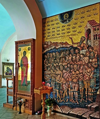 Рельеф «Сорок мучеников Севастийских» находился в одной из центральных закомар Успенского собора во Владимире (1158-1160); после пожара 1185 г. камень с почти стесанным рельефом (уцелели 2 ряда завитков - обозначения волн и нижний ряд стоящих по грудь мучеников; Воронин Н. Н. Зодчество Сев.-Вост. Руси XII-XV вв. М., 1961. Т. 1: XII ст. С. 175. Ил. 65) был вставлен в кладку юго-зап. фасада отстроенного к 1189 г. храма. Их образы встречаются в памятниках всех крупных художественных центров средневек. Руси: во фресках Феодоровской ц. на Ручью в Новгороде, 80-90-е гг. XIV в. (Лифшиц. 1987. Ил. 288-290; расположена на сев. стене наоса и у помещения под хорами, близ места, к-рое Т. Ю. Царевская признаёт как крещальню: Царевская. 2007. С. 42, 47. Ил. 155); в росписях на юж. стене Петроверигского придела Успенского собора Московского Кремля, кон. XV в., непосредственно над погребением свт. Феогноста, митр. Киевского, Московского чудотворца (сохр. 24 фигуры из 40; симметрично им были размещены 7 Эфесских отроков, как символы Воскресения); по мнению Т. В. Толстой, их изображение было связано с погребальным назначением придела и его посвящением памяти основателя храма, свт. Петра, митр. Московского, чудотворца (Толстая. 1998. С. 135-139). Исповедничество С. м. подчеркнуто в рус. памятниках не только динамикой и драматизмом жестов и ракурсов: на фреске в новгородской Феодоровской ц. стоящий на переднем плане воин-средовек левой рукой поддерживает свою десницу с благословляющим перстосложением (Царевская. 2007. Ил. 156, 157). В росписях больших соборов Московской Руси сцена с изображением их страдания размещалась в самом наосе - на юж. стене Благовещенского собора Сольвычегодска (1600).