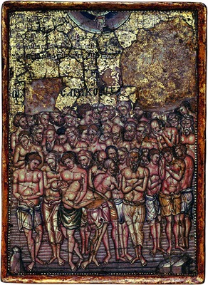 В византийском и древнерусском искусстве извод мучения святых получал разные варианты в зависимости от формата поверхности и возможностей художников. В сценах на рельефных складнях или миниатюрах композиция могла выстраиваться ярусами или сокращаться. На среднике складня-авория к-польской работы (кон. X-XI в., ГЭ) обнаженные мужи стоят в воде тесными рядами, в небесах над ними - 40 венцов. Образы святых через ракурсы и жесты показаны с редким накалом драматизма, эмоциональностью: кто-то скрестил на груди руки, кто-то поддержал ослабевшего, кто-то взмолился, подняв очи горе или опустив главу, но подняв руки; выше справа показаны баня и спина воина, убежавшего из рядов, еще выше, на звездном фоне,- Христос на престоле, благословляющий святых и подающий им венцы. Драгоценные произведения к-польских мастеров находили параллели в посвященных святым речах и сочинениях, напр. поэта Христофора Митиленского (Царевская. 2007. С. 158-159). На миниатюре в Минологии на февр.-март на золотом фоне показаны в верхнем ряду благословляющая с небес Десница, парящие венцы, пересчитать к-рые можно только по красным камням в центре каждого; ниже - фигуры святых, стоящих не в воде, а на льду почти без одежды. Тела мучеников испещрены ранами, из к-рых струи стекают и собираются на поземе в виде кровавых следов (ГИМ. Син. греч. 183. Л. 179, 2-я четв. XI в.; Древности мон-рей Афона X-XVII вв. в России: Кат. выст. М., 2005. С. 129. Кат. II. 6). Сходные композиции в составе минейных циклов на синайских иконах-складнях: на диптихе 2-й пол. XI в. (вода служит лишь фоном) и на иконе письма иером. Иоанна Тохаби, части из гексаптиха кон. XI - нач. XII в. (святые стоят в воде по грудь; Sotiriou M. et G. 1956. Р. 134, 136), на миниатюре в Минологии из Мессины (Mess. Salvad. 27. Fol. 190v), в московском Минологии (ГИМ. Син. греч. 183. Л. 91), в Минологии деспота Димитрия II Палеолога (Bodl. gr. th. f. 1. Fol. 31v, между 1322 и 1341 гг.), в греко-грузинской рукописи кон. XV в. (Евсеева. Афонская книга. С. 282. Ил. 129).