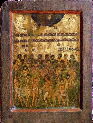 На поздних рус. иконах могут совмещаться неск. эпизодов (святые перед царем, уверовавший стражник): иконы XVII в. (ЦМиАР, ГИМ; Госкаталог РФ. № 9325541, 23666675). Вероятно, появление такого варианта было предопределено поствизант. влиянием, сохранились похожие иконы, возможно паломнические евлогии,- икона XVIII в. балканского происхождения с греч. подписями, где изображение страданий С. м. в озере сопровождается внизу 3 сценами: мучение 2 святых из числа С. м. по приказу военачальников, святых везут на казнь, их тела сжигают (ИркОХМ; Госкаталог РФ. № 11023801). Древний извод сохранялся в старообрядческой иконописи (иконы XIX в. в ГИМ, МИИРК; кон. XIX - нач. XX в. в ЦМиАР; Госкаталог РФ. № 21862823, 22392713, 15007235), в т. ч. в составе икон с избранными сюжетами и святыми,- икона XVIII в. из собрания Н. П. Лихачёва (Лихачев Н. П. Мат-лы для истории рус. иконописания: Атлас снимков. СПб., 1906. Ч. 2. Табл. CCCXXXV. № 659). Иконы-пядницы получали обрамление из образов святых, следуя визант. традиции,- икона XVII в., частью под записью, ГЭ (Госкаталог РФ. № 14009463). Иконы храмового размера писали в академической манере, передавая анатомию по законам светотени, ландшафт - по законам натурализма, как на иконе 1724 г. (РГИАХМЗ; Хохлова. 2009. С. 54-55. Кат. 8), сер. XVIII в., ГТГ (Комашко Н. И. Рус. икона XVIII в. М., 2006. С. 66, 320. Кат. 39); академический вариант приспосабливали для икон меньшего формата, напр. иконы-пядницы 1-й четв. XVIII в. из собрания МЗДК, кон. XVIII - нач. XIX в. (Гос. музей истории русской литературы им. В. И. Даля; Госкаталог РФ. № 9346295, 23155045). С возрождением традиций личных патрональных икон связано появление отдельных образов святых из числа С. м., судя по прориси, с поясным образом мч. Валерия (Иулиания (Соколова), мон. Труд иконописца. Серг. П., 1995. Прил. 1. Рис. 46). Разнообразием изводов отличается иконография С. м. в совр. произведениях, связанных с посвященными им храмами напр., в московской церкви во имя С. м. образы святых, сгруппированные по 3 на иконах, обрамляют иконостас.