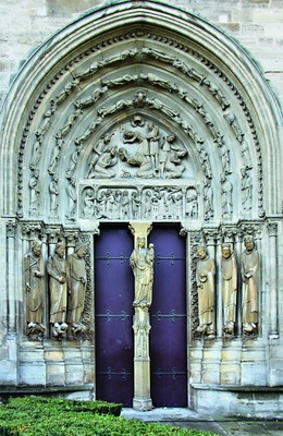 В 1140-1144 гг. с вост. стороны к нефу эпохи Фульрада была пристроена новая апсида с двойным амбулаторием и венцом капелл, считающаяся одним из первых и наиболее выдающихся памятников готической архитектуры. Символическое значение своего проекта перестройки церкви аббат Сугерий объяснил в 2 трактатах («Liber de rebus in administratione sua gestis» и «De consecratione ecclesie sancti Dionisii»). По-видимому, его архитектурный замысел был пронизан неоплатоническими идеями, почерпнутыми из «Ареопагитик», гл. обр. из соч. «О небесной иерархии», а также из комментариев к нему, составленных Гуго Сен-Викторским († 1141). Сугерий считал, что красота - свет, исходящий из божественного источника, а потому созерцание предметов, преображенных светом, дает возможность созерцающему в анагогическом движении вознестись от видимых вещей к невидимым и далее к источнику света - Богу. Чтобы наполнить светом старый неф каролингской эпохи, капеллы новой апсиды были украшены витражами во всю высоту стен, вдоль них фактически шли 2 амбулатория, разделенные 12 колоннами, что увеличивало объем заполняемого светом пространства. Согласно Сугерию, на строительство апсиды, заложенной 14 июля 1140 г., ушло 3 года и 3 месяца; 11 июня 1144 г. она была торжественно освящена. На церемонии присутствовали 19 епископов (в т. ч. архиепископ Кентерберийский Вильгельм Корбейский), а также кор. Людовик VII с супругой Алиенорой Аквитанской и матерью Аделаидой Савойской. Король собственноручно перенес мощи св. Дионисия из крипты, выстроенной во времена аббата Хильдуина, в богато украшенную раку в алтарной части церкви. В последние годы правления Сугерия был выстроен также сев. портал (т. н. портал Валуа), сохранившийся лучше западных, сильно перестроенных позднее. Портал символизирует связь династии Капетингов со св. Дионисием: 6 фигурных колонн на откосах портала изображают первых королей династии, а на тимпане помещен барельеф с изображением мученичества святого.