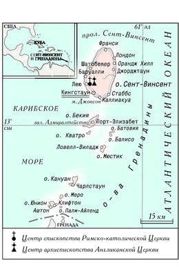 [англ. Saint Vincent and the Grenadines], гос-во в Вест-Индии, в юж. части М. Антильских о-вов (группа Наветренные о-ва). Занимает о-в Сент-Винсент и большинство прилегающих к нему с юга о-вов Гренадины (обитаемые: Бекия, Мюстик, Кануан, Меро, Юнион, М. Сент-Винсент, Палм-Айленд). Территория - 389,3 кв. км (в т. ч. о-в Сент-Винсент - 344 кв. км). Столица - Кингстаун (12,9 тыс. чел., с пригородами - 26,6 тыс. чел.; 2015). Офиц. язык - английский. Административно-территориальное деление: 6 округов (англ. parish, букв.- «приход»), в т. ч. 5 - на о-ве Сент-Винсент, 1 - на о-вах Гренадины. С.-В. и Г.- члeн ООН (1980), Содружества (1979), МВФ (1979), МБРР (1982), ОАГ (1981), Сообщества стран Карибского бассейна (КАРИКОМ; 1974), ВТО (1995). ГеографияОстрова, на которых расположен С.-В. и Г., имеют вулканическое происхождение. В сев. части о-ва Сент-Винсент находится действующий вулкан Суфриер (высота до 1234 м - высшая точка страны), южнее - цепь постепенно понижающихся конусов потухших вулканов. Береговая линия слабо изрезана, вдоль побережья тянется узкая полоса низменности. О-ва Гренадины низменные, окаймлены коралловыми рифами, имеют прекрасные пляжи. Климат тропический, пассатный. Среднемесячная температура - 26-28°C. Осадков выпадает от 1500 мм в год на низменных Гренадинах, до 3700 мм - в горах о-ва Сент-Винсент, большая часть с мая по нояб. Немалую опасность представляют частые ураганы. На о-ве Сент-Винсент - короткие горные реки, мелкие озера. Фауна представлена разнообразием видов птиц (ок. 190 видов, в т. ч. 2 эндемичных: королевский амазон и свистящий певун). Центральная часть острова покрыта влажными экваториальными лесами.